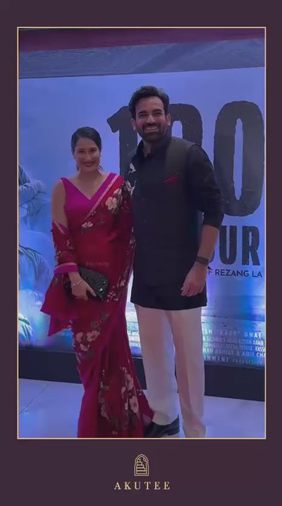 Actor Sagarika Z Ghatge in our elegant, hand-painted Satin-Crepe Tissue Saree, adorned with a Chanderi & Benarasi Brocade border.