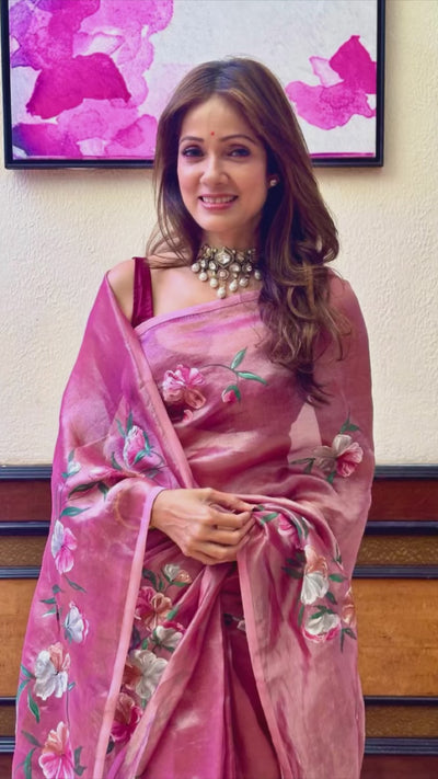 Actor Vidya Malvade in our elegant, hand-painted Silk-Tissue Saree, adorned with a a thin satin border.