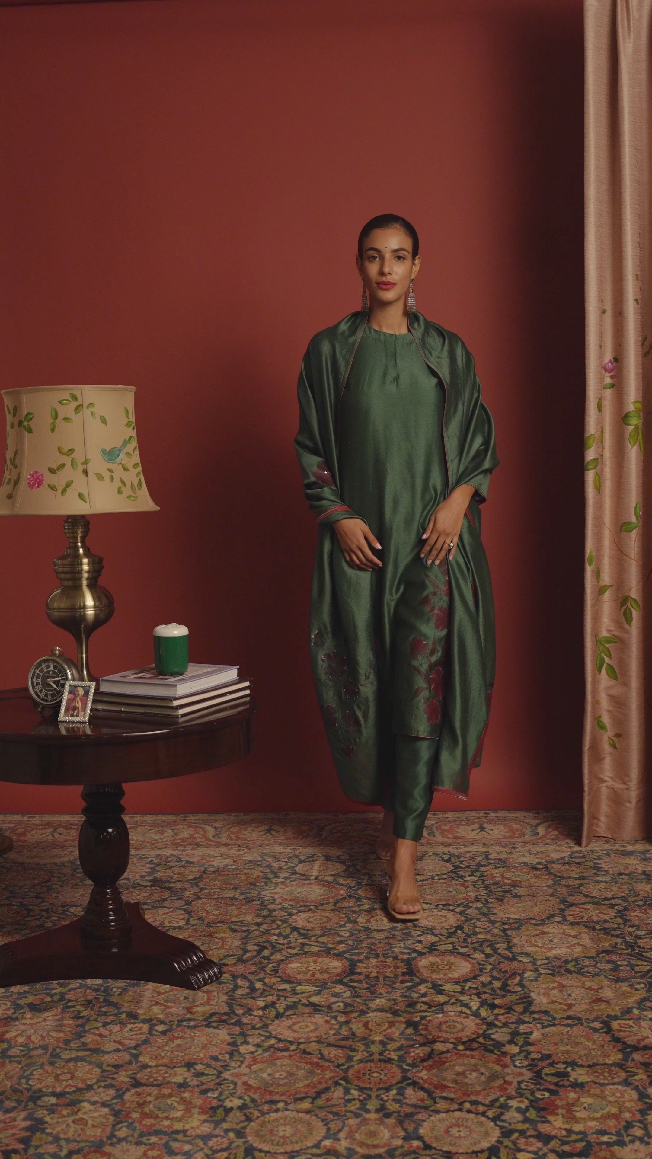 The Sanjeevani Kurta set, crafted from exquisite green handwoven Chanderi, showcasing hand-painted maroon flowers. Embrace elegance and minimalism with this meticulously handcrafted ensemble, paired perfectly with a matching dupatta featuring hand-painted maroon flowers and a refined brocade border.