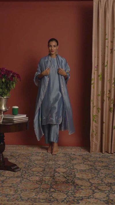 The Sumati Handwoven Chanderi Kurta in serene sky blue, adorned with delicate hand-painted flowers and butterflies. This exquisite ensemble perfectly complements a matching Chanderi dupatta featuring enchanting motifs and a luxurious brocade border.